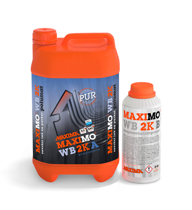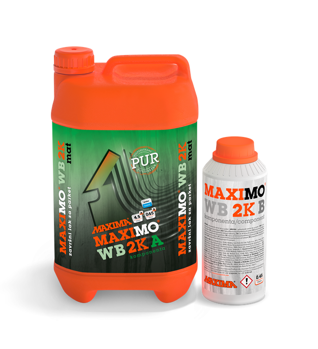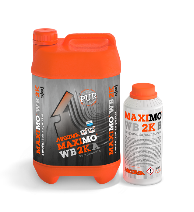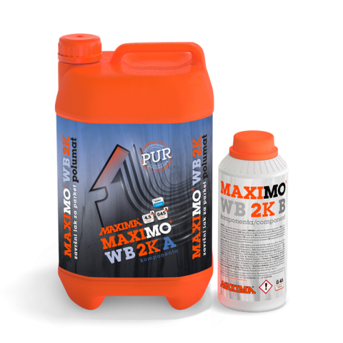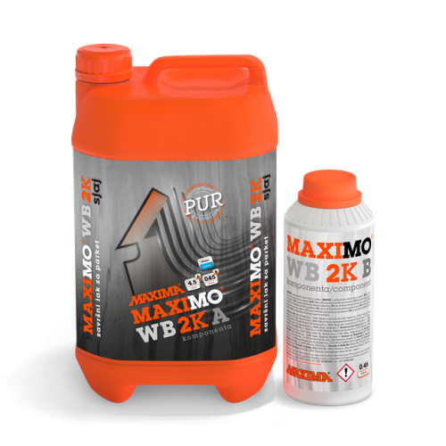 Nanošenje laka: MAXIMO WB 2K je dvokomponentni poliuretanski sustav. Omjer komponenti je A:B=10:1. Svaku komponentu treba odvojeno promućkati i zatim polako sipati komponentu B u komponentu A, mućkati do potpune homo-genizacije. Sačekati 15 minuta, ponovo promućkati sjedinjenu smjesu i procijediti. Ovako pripremljen lak spreman je za uporabu i mora se potrošiti u roku od 4 sata. Lak ravnomjerno nanositi mikrofiber valjkom predviđenim za tu namjenu. Poslije 4 sata lagano prebrusiti lak brusnim papirom 320 ili strojno mrežicom 220-240, usisati prašinu, prebrisati i nanijeti završni sloj laka za parket. Poslije svakog lakiranja, oruđe odmah oprati vodom, jer se osušeni film laka može odstraniti samo mehanički.