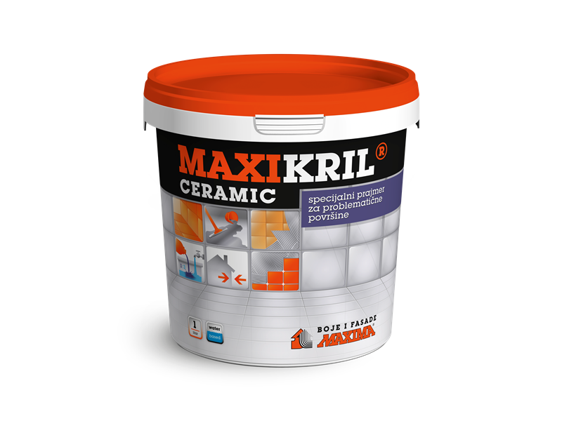 (glazirane pločice, beton, kamen, teraco, gips ploče, plinobetonski elementi, gipsane, vapnene i cementne strojne žbuke), a prije nanošenja ljepila i masa za izravnavanje. MAXIKRIL Ceramic se lako nanosi, brzo suši i kvalitetno impregnira podlogu, ima vrlo visoku vodoodbojnost i vezivnost. Premazane površine su ujednačene, ne upijaju i poboljšavaju adheziju ljepila. MAXIKRIL Ceramic ne koristiti kao podlogu za boje i dekorativne žbuke.