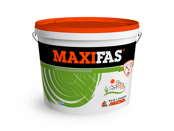 MAXIFAS je kvalitetna fasadna boja, na bazi akrilata. Dobro prianja na podlogu, ima odličnu pokrivnu moć, paropropusnost, vodoodbojnost i postojanost na atmosferske utjecaje i UV zračenje. Upotrebljava se za zaštitu i dekoraciju vanjskih i unutarnjih površina od: betona, produžne žbuke, plinobetona, azbest-cementa i sl. Ne preporučuje se za bojenje svježih, još nekarboniziranih vapnenih i vapneno-cementnih površina (min. 28 dana). Proizvodi se u bijeloj boji i kao baza za nijansiranje na MAXIMIX sistemu.