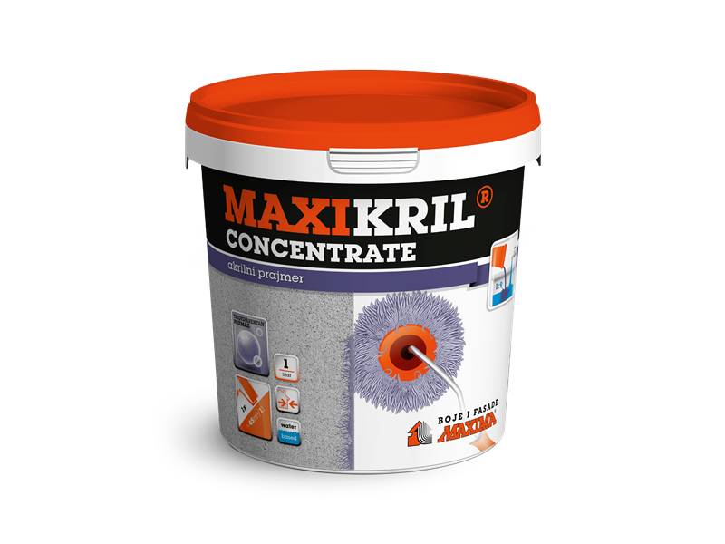 Površina mora biti: suha, nosivo sposobna, očišćena od prašine, masnoća, trošnih dijelova i starih premaza. Prije upotrebe MAXIKRIL Concentrate razrijediti vodom u odnosu 1:9. Nanošenje vršiti valjkom, četkom ili strojem za špricanje, u jednom sloju. Vrijeme sušenja, pri optimalnim uvjetima, je min. 6 sati. Poslije upotrebe, alat odmah oprati vodom.