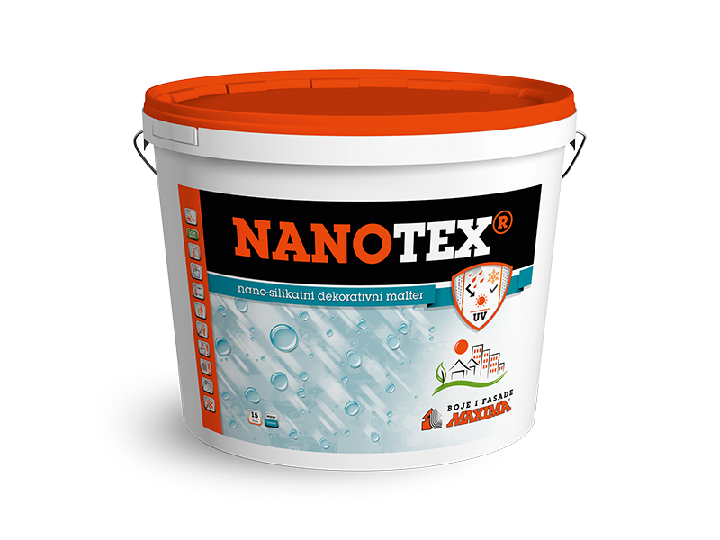 NANOTEX je kvalitetna dekorativna žbuka na bazi kompozitnih veziva. Odlikuje se odličnom adhezijom na podlogu, izraženom paropropusnošću, čvrstoćom, otpornošću na prljanje i visokom vodoodbojnošću. Otporan je na atmosferske utjecaje i UV zračenje. Namijenjen je za zaštitu i dekoraciju vanjskih i unutarnjih mineralnih zidnih površina. Završni je sloj pri izradi termoizolacijskih fasada. Proizvodi se u bijeloj boji, a može se tonirati i na MAXIMIX sistemu, u nijansama označenim sa F.